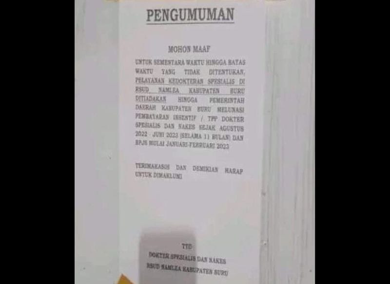 “Untuk sementara waktu, hingga batas waktu yang tidak ditentukan, pelayanan kedokteran spesialis di RSUD Namlea ditiadakan hingga Pemerintah Kabupaten (Pemkab) Buru melunasi pembayaran insentif/ TPP dokter spesialis dan Nakes,” bunyi kalimat yang tertuang dalam pengumuman tersebut, Rabu (5/7/2023).