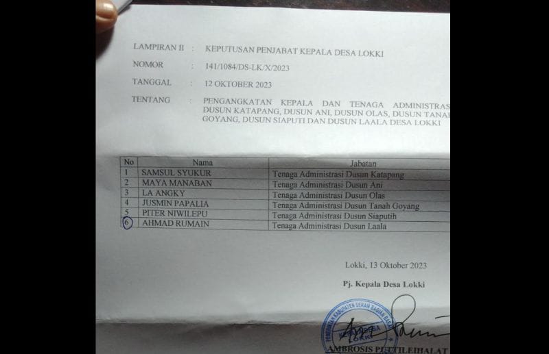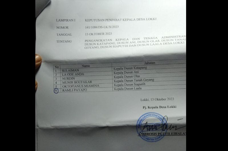 Hal itu juga tidak terlepas dari janji Penjabat Desa Lokki pada September 2023 lalu, untuk mengeluarkan SK kepada sejumlah Kadus.