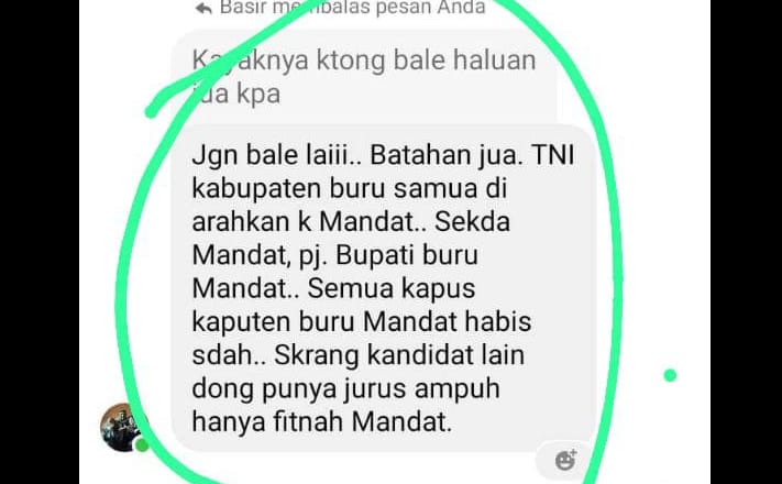 “TNI di Kabupaten Buru, Sekda, PJ Bupati dan Kepala-Kepala Puskesmas di Kabupaten Buru semua sudah diarahkan ke MANDAT,” begitu pesan yang dikutip dari akun messenger bernama Basir.
