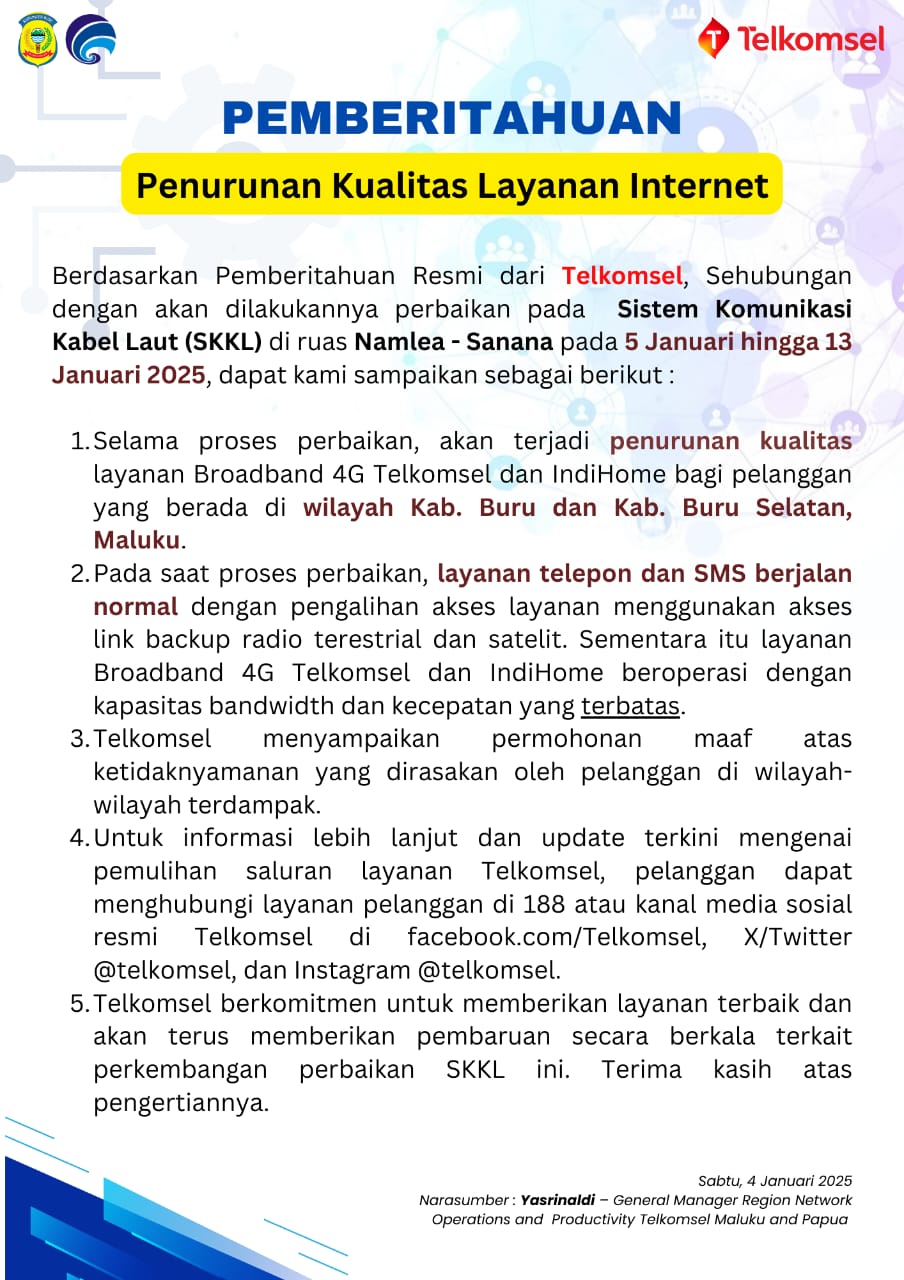 Alasan tidak normalnya jaringn internet di dua kabupaten itu, karena akan dilakukannya perbaikan pada Sistem Komunikasi Kabel Laut (SKKL) di ruas Namlea – Sanana pada 5 sampai 13 Januari 2025.