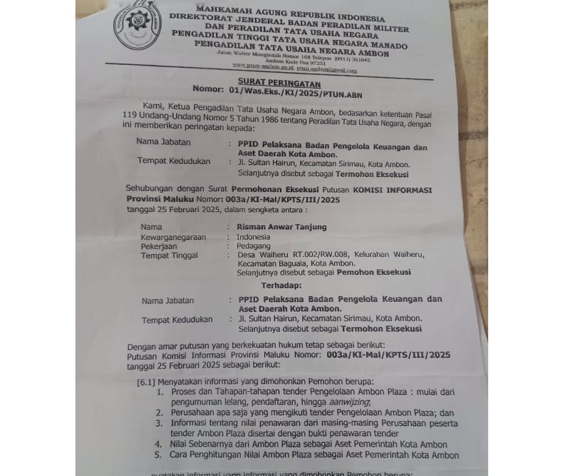 PTUN Ambon mengeluarkan surat peringatan itu, sehubungan dengan Surat Permohonan Ekskusi Putusan Komisi Informasi Provinsi Maluku Nomor: 003a/KI-Mal/KPTS/III/2025, dengan tembusan ditujukan kepada Gubernur Maluku, DPRD Kota Ambon, Walikota Ambon, Kepala Kejaksaan Negeri Ambon, dan Risman Anwar Tanjung, selaku pemohon eksekusi.