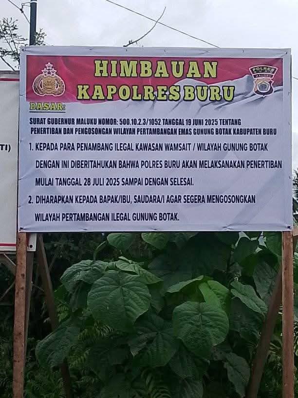 Tindakan penertiban tersebut dilakukan berdasarkan Surat Gubernur Maluku, nomor ;500.10.2.3/ 1052 Tanggal 19 Juni 2025 tentang penertiban dan pemgosongan wilayah pertambangan emas gunung botak Kabupaten Buru.