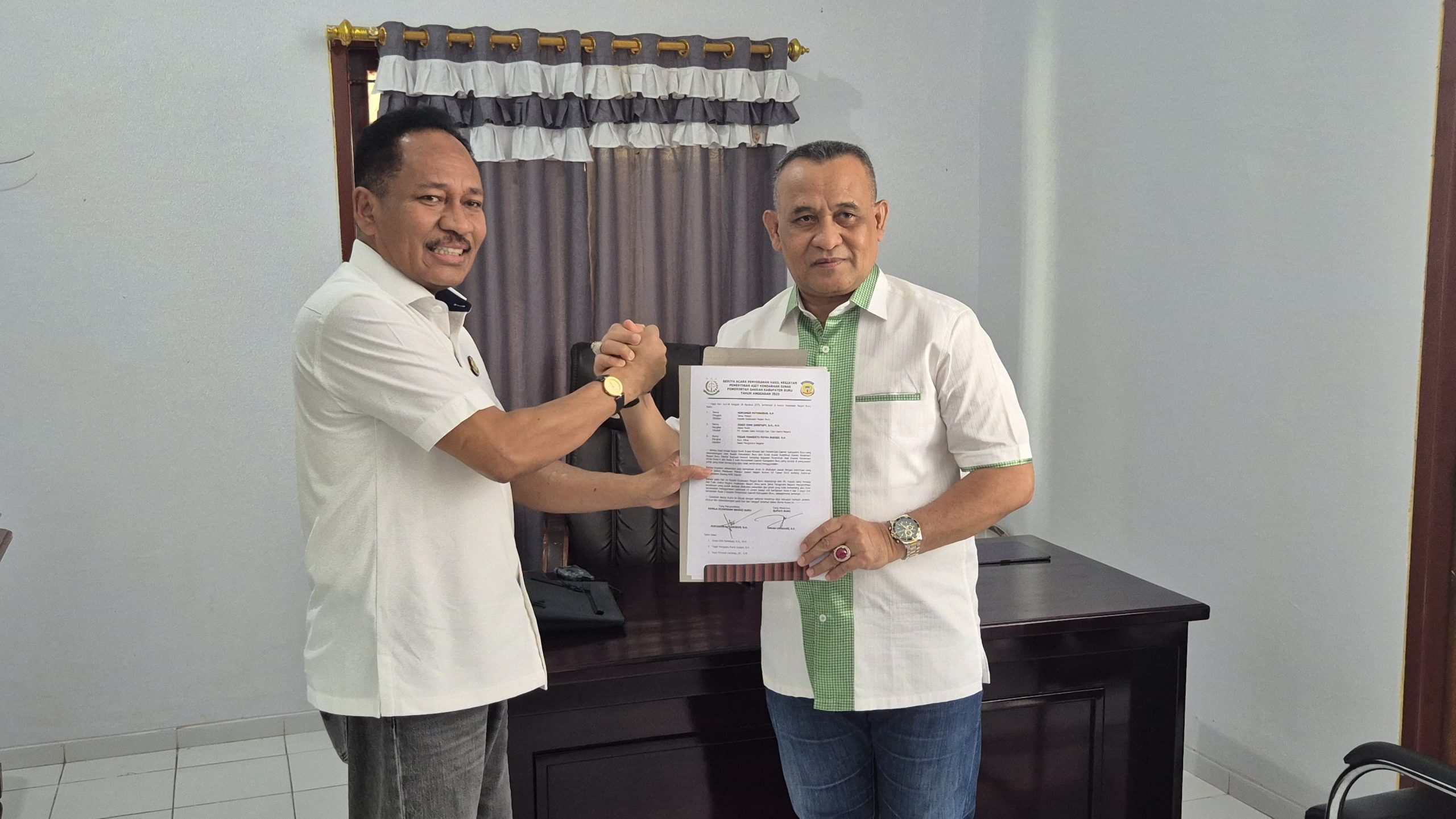 Kejari Buru Adrianus Notanubun bersama Bupati Buru Ikram Umasugi saat penandatanganan surat penyerahan aset daerah.